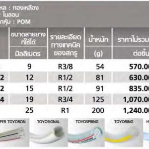 | รหัสสินค้า | ข้อมูลจำเพาะของเกลียว | ขนาด (มม.) | น้ำหนัก | หีบห่อ | |||