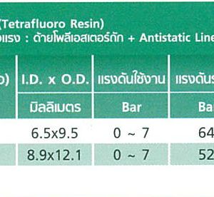 | คุณลักษณะเฉพาะของผลิตภัณฑ์ | วัสดุหลัก: เททราฟลูออโรเรซิน วัสดุเสริมแรง: เส้นใยโพลีเอสเตอร์ ID: 6 mm ~ 8 mm ช่วงอุณหภูมิใช้งาน: -30℃ ~60℃ |