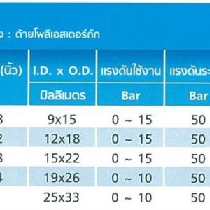 | คุณลักษณะเฉพาะของผลิตภัณฑ์ | วัสดุหลัก: PVC อ่อน วัสดุเสริมแรง: เส้นใยโพลีเอสเตอร์ ID: 9 mm ~ 25 mm ช่วงอุณหภูมิใช้งาน: -5℃ ~60℃ |