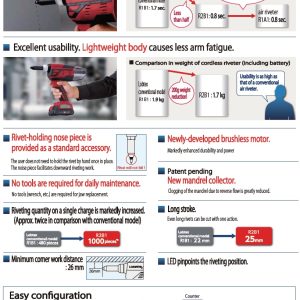 | R2B1 | 1.7kg | 307mm | 261mm | 21mm | 72mm | 63mm | 26mm | 36mm | 76mm | riveter、battery pack(2.0Ah)、charger、A active grip nose piece unit、jaw pusher unit、hanger、lubricating oil、dedicated blow case | φ2.4・3.2・4.0・4.8mm | – | CJM | 10.5kN | 1 | open price | – |