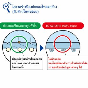 TOYOTOP-E 100°C เป็นสายยางที่มีคุณสมบัติทนความร้อน ทนการสึกหรอ และป้องกันไฟฟ้าสถิต เหมาะสำหรับใช้ลำเลียงเม็ดพลาสติกอุณหภูมิสูงในโรงงานฉีดพลาสติกมีคุณสมบัติทนความร้อนถึง 100°C จึงสามารถใช้ได้กับทั้งงานดูดและงานจ่ายแรงดัน สำหรับพลาสติกวิศวกรรมที่เป็นผงและเม็ดที่ผ่านการอบแห้งก่อนฉีด ป้องกันการบิดงอและยุบตัวของสายยางเนื่องจากอุณหภูมิสูง นอกจากสายยางจะเกิดรูรั่วน้อยลง เศษท่ออ่อนและสายต่อกราวด์ (ลวดทองแดง) ปนเปื้อนได้ยากขึ้น ยังสามารถช่วยเพิ่มประสิทธิภาพในการผลิตด้วยการป้องกันการอุดตันของวัตถุดิบที่เกิดจากไฟฟ้าสถิตได้อีกด้วยการเสริมความแข็งแรงด้วยลวดโลหะ ทำให้สายยางลำเลียงได้อย่างราบรื่นในขณะที่ยังคงรูปไว้ได้อย่างดีเยี่ยมแม้ที่อุณหภูมิสูง ผิวด้านในเป็นวัสดุยูริเทนแบบพิเศษที่ทนต่อการสึกหรอ ซึ่งมีความทนทานมากกว่าผลิตภัณฑ์ทั่วไปอย่างน้อยถึง 3 เท่า (เทียบกับผลิตภัณฑ์ของ TOYOX) ความแตกต่างจากสายยางทั่วไปที่ผสมสารป้องกันไฟฟ้าสถิต คือการมีโครงสร้างแบบรวมลวดโลหะที่จะสะสมไฟฟ้าสถิต เข้าเป็นชิ้นเดียวกันกับแถบป้องกันไฟฟ้าสถิตที่มีคุณสมบัติเป็นกราวด์ ช่วยรักษาคุณสมบัติป้องกันไฟฟ้าสถิตได้ในระยะยาว นอกจากนี้ โครงสร้างด้านในยังไร้รอยต่อและช่วยป้องกันปัญหาการอุดตันของเม็ดพลาสติก